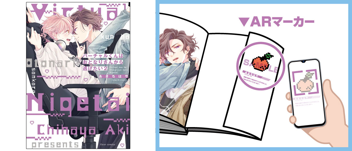 コミックス折り返しのあきちはや先生自画像部分がARマーカーになっています。ARマーカーを読みとって、キャラクターと一緒に写真が撮れます。