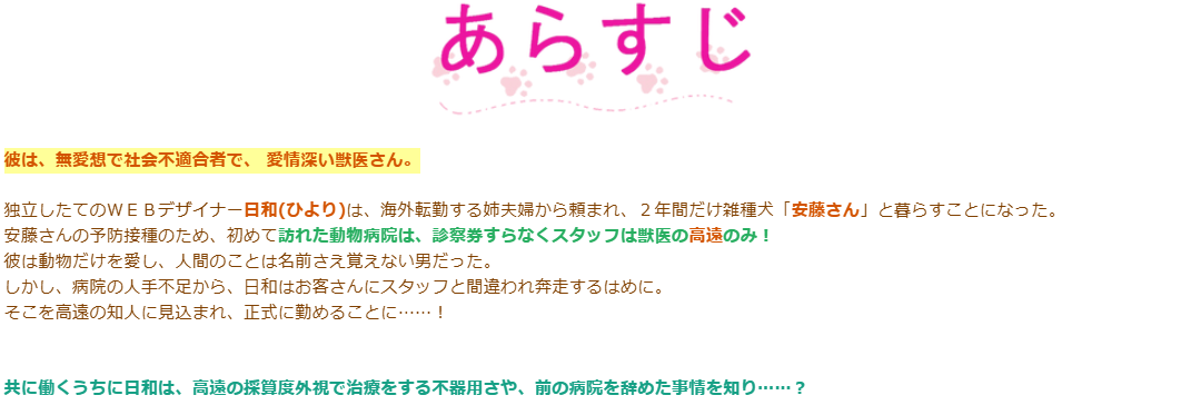 安藤さんの予防接種のため、初めて訪れた動物病院は、診察券すらなくスタッフは獣医の高遠のみ。彼は動物だけを愛し、人間のことは名前さえ覚えない男だった。