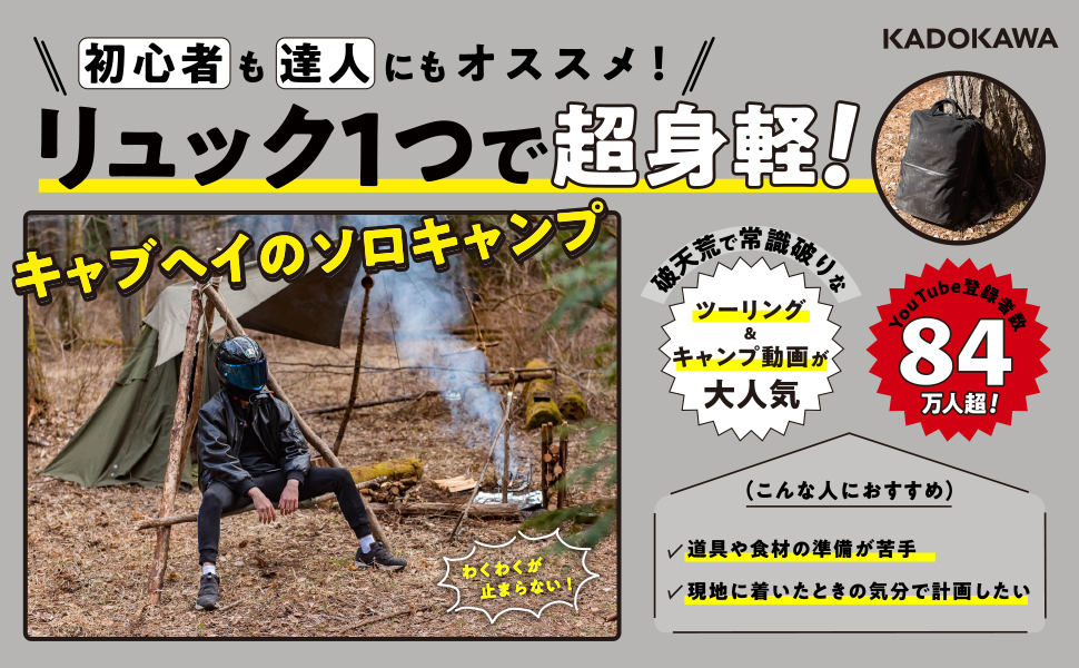 YouTube登録者数83万人超、破天荒で常識破りな ツーリング&キャンプ動画が大人気!テント、ナイフ、ランタン、寝袋、焚き火セット…最小限の荷物に収めるミニマムで合理的なギア選び、限りなく工程を省いた料理、おすすめ100円ショップグッズ、ミニマムなソロキャンプ道具、焚き火でChill&ブッシュクラフトしようぜ…わくわくが止まらないキャブヘイ流ソロキャンプ大公開!