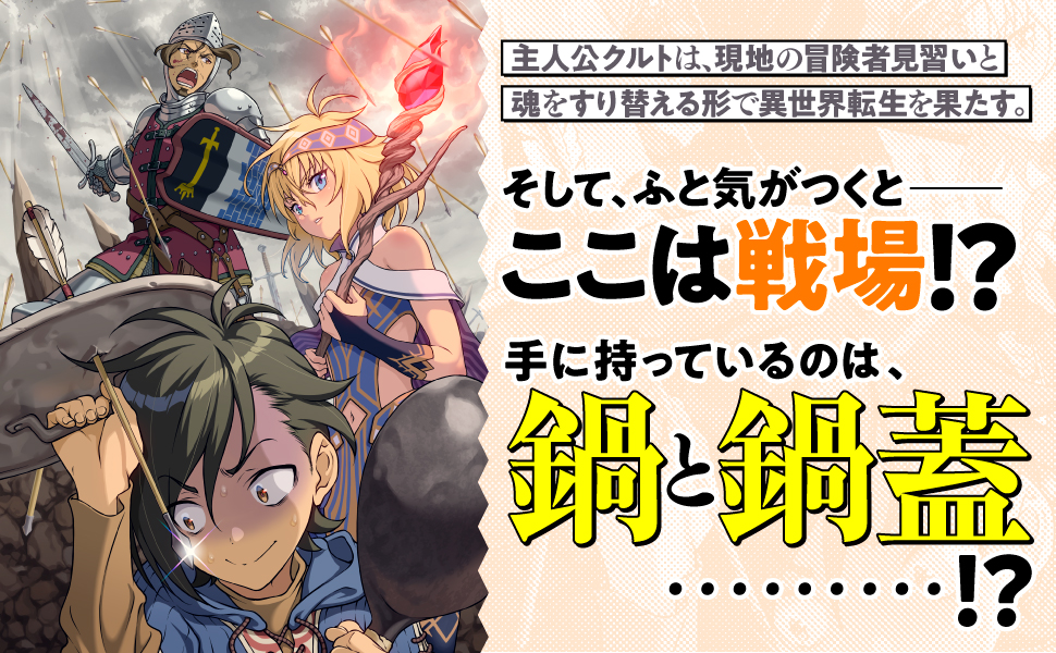 日本の男子高生だったが、神聖ローマ帝国風の異世界に暮らす冒険者見習いクルトとして転生。しかし、気がつくとそこは戦場、手に持っていたのは鍋と鍋蓋であった……!