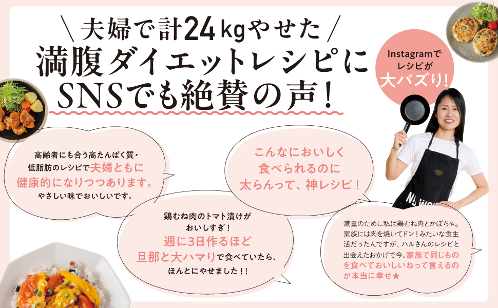 40歳を過ぎたころから、そんなに食べたつもりはないのに体重が増え、45歳の時の健康診断で内臓脂肪型肥満と診断される。夫も高血圧症の診断を受け、このままでは夫婦ともに病気になってしまうと一念発起。まずは食生活を見直し、低脂質でたんぱく質をしっかり摂れるレシピを考案。インスタグラムでそのレシピを発信すると瞬く間に人気となる。実際に夫婦合わせて24キロもの減量に成功した、リアルな1日3食を、書籍で初公開! 2025年8月現在49歳。簡単につくれて美味しく、健康になれるレシピと食事の工夫を余すところなく紹介する。