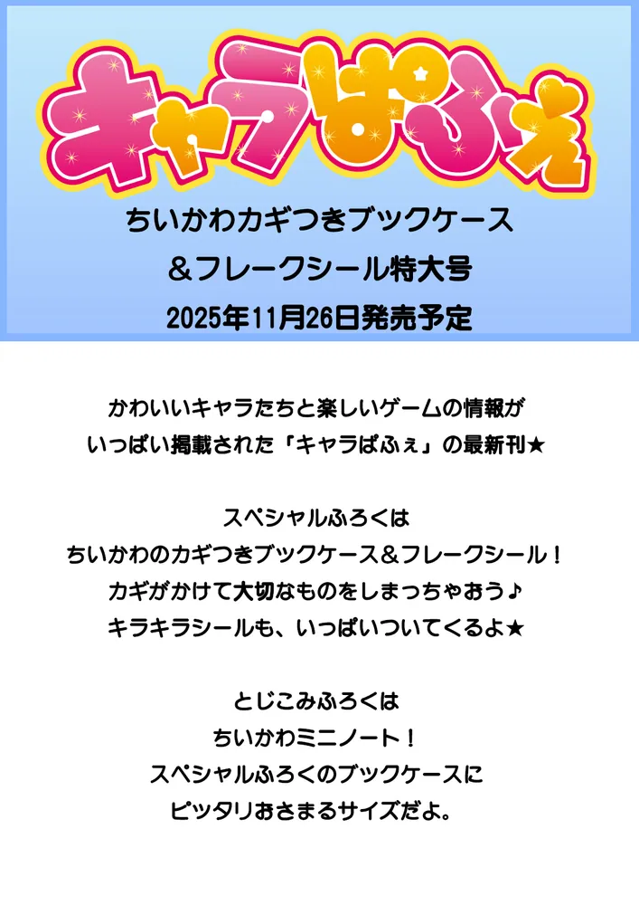 スペシャルふろくは、ちいかわのイラストがかわいいカギつきのブック型のケースと、フレークシールのセットだよ★
