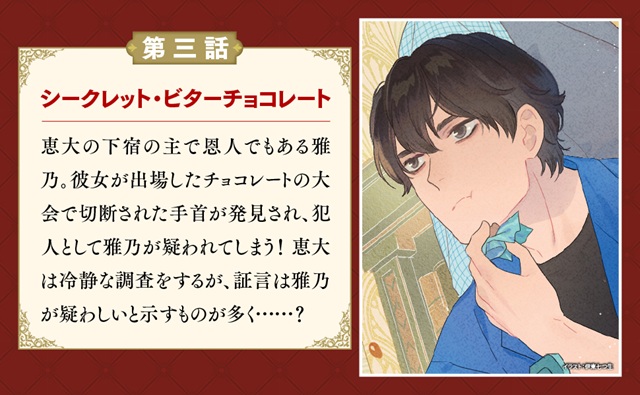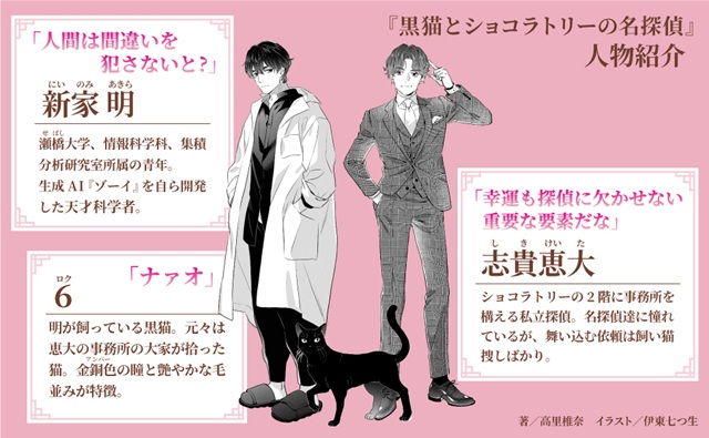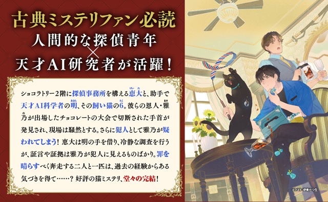 ショコラトリー2階に探偵事務所を構える恵大と、助手で天才AI科学者の明、その飼い猫の6。彼らの恩人・雅乃が出場したチョコレートの大会で切断された手首が発見され、現場は騒然とする。さらに犯人として雅乃が疑われてしまう! 恵大は明の手を借り、冷静な調査を行うが、証言や証拠は雅乃が犯人に見えるものばかり。罪を晴らすべく奔走する二人と一匹は、過去の経験からある気づきを得て……? 好評の猫ミステリ、堂々の完結!