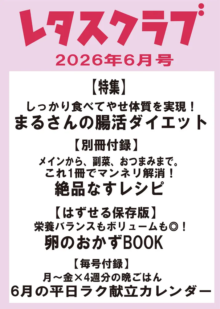 今号はダイエット特集が盛りだくさん! 料理特集は、 3カ月で12kgのダイエットに成功したダイエッター・まるさんに教わる「腸活ダイエット」。停滞期を支えてくれたという、いつものおかずに腸活食材をプラスするだけで作れるレシピがたっぷりです!