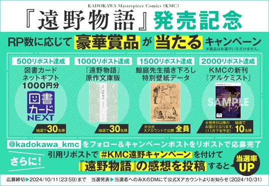 引用リポストで本作の感想を投稿いただくと、当選確率がアップします(#KMC遠野キャンペーン をつけてご投稿ください)。