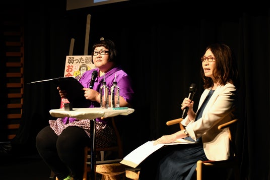 お笑いコンビ「メイプル超合金」として活動する一方、介護現場歴20年の経験を持ち、「介護福祉士」の資格を所有するなど、介護関連の現場でも活躍する安藤なつと、「遠距離介護」「高齢者施設」「仕事と介護の両立」をテーマに執筆や講演を行っている、介護・暮らしジャーナリストの太田差惠子が登壇しました。