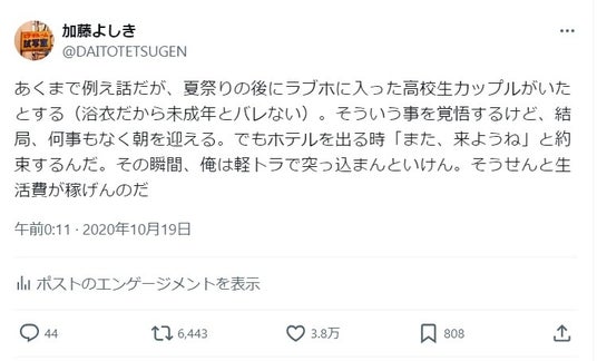 ライターとしても活躍する著者の加藤よしき氏は、数年前よりX(旧Twitter)上に「何かの危機に直面したカップルに軽トラが突っ込む」という状況を多様なバリエーションで表現したポストを投稿し、その不条理さが面白いとX上で話題を集めてきました。
