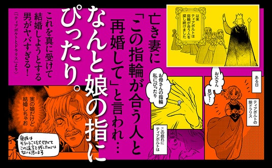 愛妻家だった領主ティアボルトは妻を亡くしてしまうのですが、死の間際に「私のはめている指輪がぴったり合う人と再婚して」と言い残します。ティアボルトは指輪のぴったりはまる再婚相手を探すのですが、なんと娘のドラリスの指にぴったり。これを受けてティアボルトは「実に娘と結婚しちゃお」と考え、娘を追いかけまわしてしまい……。(第4話「ティアボルトとドラリス」より)