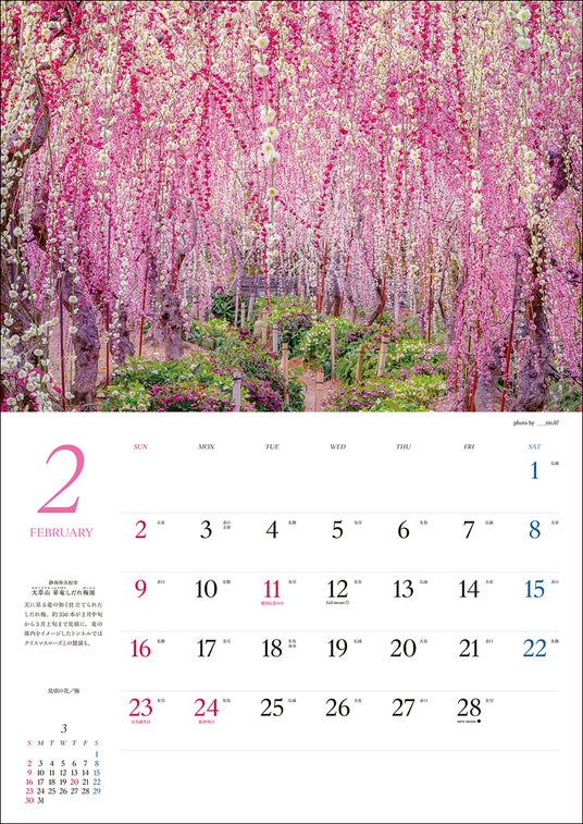 お手元に届くと、まずは華やかなカバー写真がお出迎え。新しい年への希望を感じる、紅白、ピンクの華やかなしだれ梅の絶景が目の前に広がります。