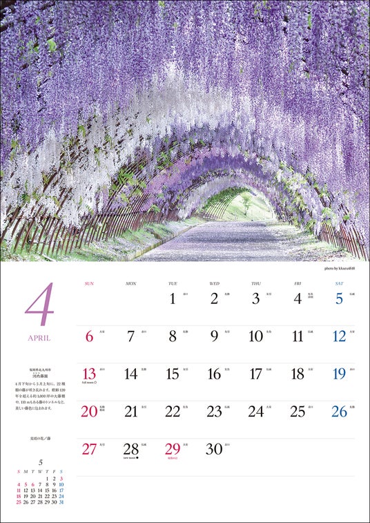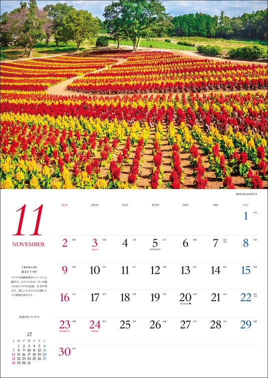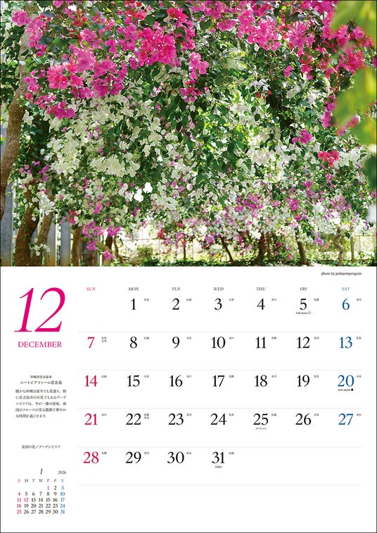 そして毎月めくるごとに日本全国ところを変え、美しい花色がシーズンの移り変わりを伝えてくれます。凛とした冬に希望を咲かせるストックの純白(兵庫)、艶やかなしだれ梅の赤と白(静岡)、天から降り注ぐ藤の紫(福岡)、夕暮れの丘に一面に広がるラベンダー色(北海道)、青空に煌めく真夏のひまわりの黄色(新潟)、そして12月、華やかに1年を締めくくるのは宮古島のブーゲンビリアのフューシャピンク……(沖縄)。にっぽんの花景色、心が躍る絶景を、ぜひ堪能してください。
