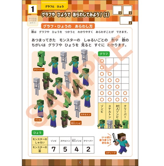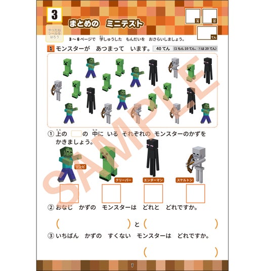 どの問題も大人気ゲーム「マインクラフト」に登場するキャラクターたちのイラストで分かりやすく出題しているので、「マインクラフト」好きのお子さまはもちろん、算数に苦手意識を持っているお子さまも飽きることなく取り組むことができます。