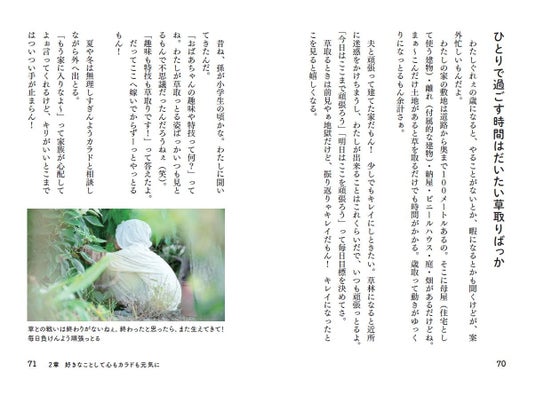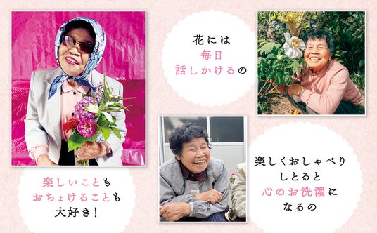 ひとりで過ごす時間はだいたい草取りばっか/お花を育てることが大好き!/体操は毎日欠かさずやっとるよ/画面のアレのおかげで嬉しいことがいっぱいあったよ/介護美容で心ウキウキだ/みんなに支えられて生きてきた/よくいただく質問 ほか