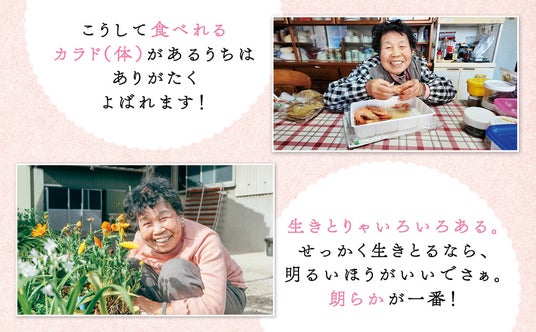 好奇心旺盛で天真爛漫、食べることが大好きでキュートな笑顔が魅力のおばあさんの姿に「元気になる」「笑顔が大好き」「面白くていつも笑いながらみている」「家族との時間を大切にしたい」「亡くなった親や祖父母のことを思い出す」「自分の祖母と話したくなって電話した」などの声が多く寄せられている。