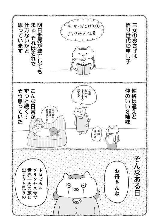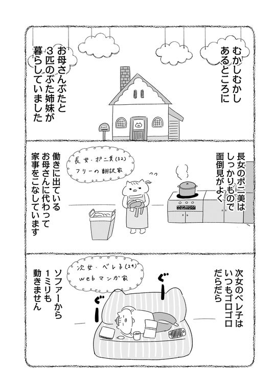 タワマンに住む長女・ポニ美、売れない漫画家の次女・ベレ子、彼氏と同棲中の三女・おさげ。
