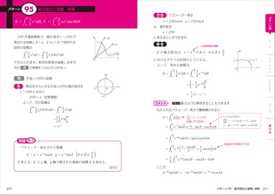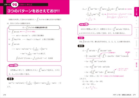 そして、数学IIIの重要テーマを、「関数」9パターン、「数列の極限」13パターン、「関数の極限」14パターン、「微分法」32パターン、「積分法」32パターンにわたって収録しています。大学入試で問われやすい「微分積分」だけで6割を占めていますので、本書を学習した効果が模試や入試の点数として表れやすい、即効性の高い参考書とも言えます。