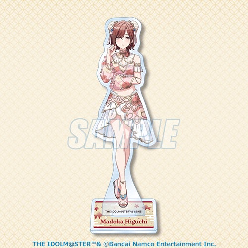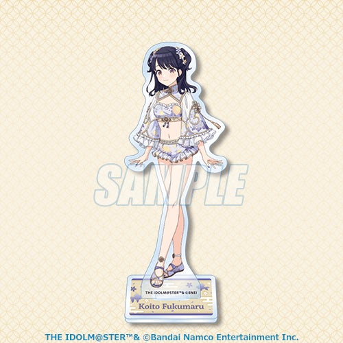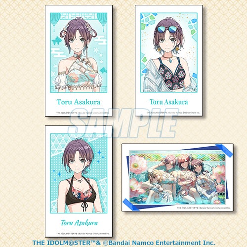商品は水着衣装に身を包み、ユニット別スタイルブックの表紙にもなった「浅倉 透」「樋口円香」「福丸小糸」「市川雛菜」の特大タペストリーやアクリルスタンドのほか、バッグの中身ページで紹介されたアイドルたちが持ち歩いている愛用品のイラストを使用した3個セットのアクリルミニチャーム、ゲーム内で使用された歴代の水着イラストやカードイラストを使用したミニブロマイドセットやスクエア缶バッジ等、オリジナルグッズを多数展開しております。