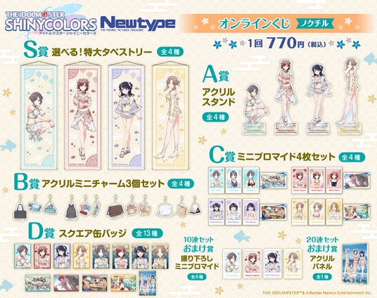 株式会社KADOKAWA(本社:東京都千代田区、取締役 代表執行役社長 CEO:夏野 剛、以下 KADOKAWA)は、運営するオンラインくじサービス「くじ引き堂」において、『アイドルマスター シャイニーカラーズ』の豪華賞品が手に入る<アイドルマスター シャイニーカラーズ Newtype オンラインくじ ノクチル>を、2025年2月6日(木)12時より販売します。