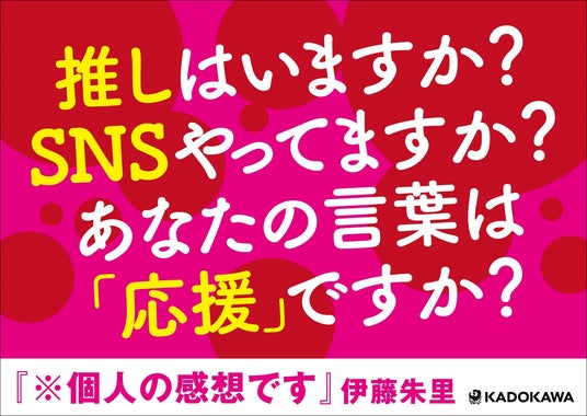 株式会社KADOKAWA(本社:東京都千代田区、取締役 代表執行役社長 CEO:夏野剛)は、伊藤朱里さんによる「推し」とSNSをめぐる4編の小説集『※個人の感想です』を2025年1月31日(金)に発売しました。今年デビュー10周年を迎える伊藤朱里さんは、『きみはだれかのどうでもいい人』で『ダ・ヴィンチ』の「今月の絶対にはずさない!プラチナ本」に輝くなど、鋭い観察眼で日常を切り取り読者の共感を呼ぶ注目の書き手です。