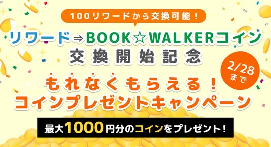 BOOK☆WALKERコインへのリワード交換を完了するだけで、最大1000円分のコインがもらえるチャンスです。