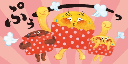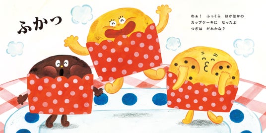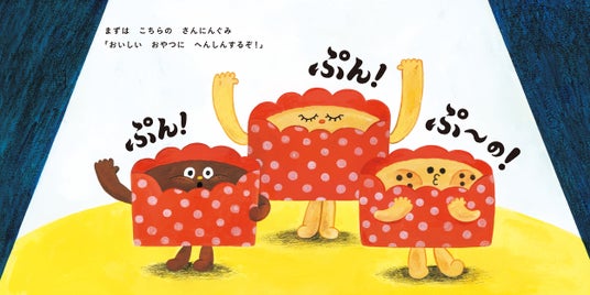 本作は、子どもたちが大好きな「カップケーキ」「プリン・ゼリー」「ポップコーン」「くだもの」が主役のユーモア絵本。