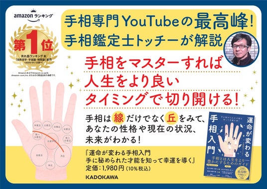 株式会社KADOKAWA(本社:東京都千代田区、取締役 代表執行役社長 CEO:夏野剛、以下KADOKAWA)は、2025年2月4日(火)に『運命が変わる手相入門 手に秘められた才能を知って幸運を導く』(著者:手相鑑定士トッチー)を発売しました。