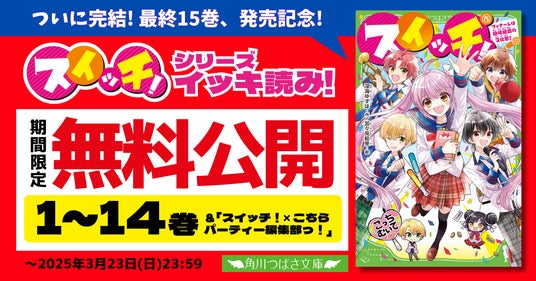 株式会社KADOKAWA(本社:東京都千代田区、取締役 代表執行役社長 CEO:夏野 剛)は、角川つばさ文庫より、大ヒット学園ラブコメシリーズ最新作『スイッチ!15. フィナーレは絶体絶命の文化祭!』を2025年3月12日(水)に発売いたします。あわせて「スイッチ!」シリーズ関連本の【計15冊一挙無料公開】を、期間限定で実施します。