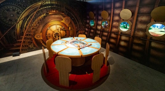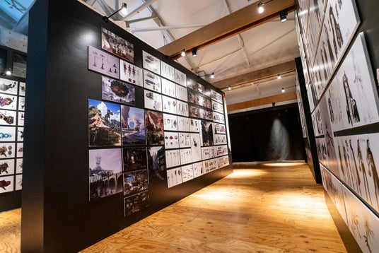ワールドマップやコンセプトアートなど「世界観」をテーマにした展示エリアとなります。さらにこちらでは「鎧戦車」のフォトスポットも展開。実際に椅子に座って写真撮影をお楽しみいただけます。窓にはゲーム中で「鎧戦車」から見える映像が流れており、旅の臨場感を演出しています。