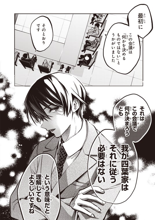 二〇九七年四月。二十八家の若い世代を集めた会議の日がやってきた。活発化する反魔法主義運動に対抗すべく自由な意見を出し合っていきたい――七草智一(さえぐさ ともかず)と十文字克人(じゅうもんじ かつと)の主導で議論はにわかに活気づく。だが、大衆に対する人気取りのために司波深雪(しば みゆき)を押し出してはという流れに対し、司馬達也(しば たつや)は即座に痛烈なNOを突き付けるのだった。