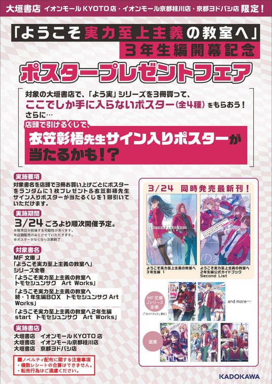 『よう実』対象書籍を3冊買うごとに、3年生編キービジュアルを使用したポスターをランダムに1枚プレゼント(全4種)&衣笠彰梧先生サイン入りポスターが当たるくじを1回ひける!