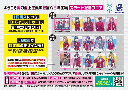 KADOKAWA MF文庫Jから刊行されている大人気ライトノベルシリーズ『ようこそ実力至上主義の教室へ』の、いよいよ始まる3年生編を目前に、豪華な書店施策情報を一挙公開! ここでしか手に入らない特別な特典や、記念展示の情報が盛りだくさん!