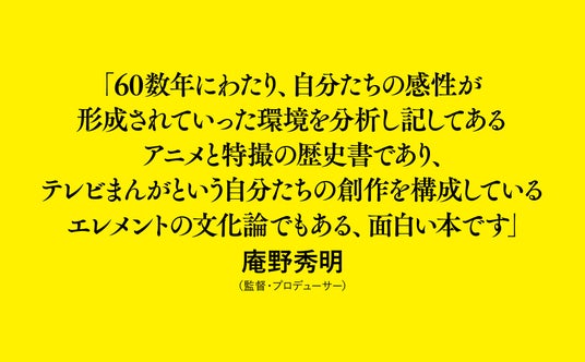 今回描き下ろしされたイラストをカバーに使用した1冊。アニメ・特撮が混然一体だった1960、70年代「テレビまんが」から考える画期的メディア文化論! スタジオジブリ刊行の小冊子『熱風』にて連載された「昭和アニメージュの功罪 テレビまんがの死と再生」の単行本化となります。