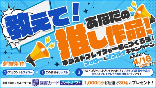 株式会社KADOKAWA(本社:東京都千代田区、取締役 代表執行役社長 CEO:夏野剛)が運営するカドコミ(https://comic-walker.com/)は、公式Xアカウント(@Kado_comi)をフォロー&リプライで参加できる「教えて!あなたの推し作品 ~ネクストブレイクを一緒につくろう!~」キャンペーンを2025年4月4日(金)よりスタートしました。応募条件を満たした方の中から抽選で30名に図書カードネットギフトをプレゼントします。また、リプライで集まった推し作品の中からカドコミで特集掲載を予定しています。