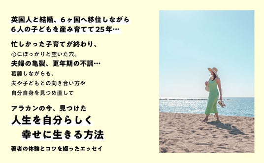 「この本の出版をオファーされた当時、まだ深い悩みの中にいた私ですが、1年以上かけて書いていきながら、徐々に自分らしい幸せとは何かに気が付き、自分らしさをを取り戻していきました。そしてアラカンの今では『今が最高に幸せ』と言えるようになりました。私は子育ての時期、「家族を一番に」と考えていたため、私自身の幸せをどこかになくしてしまっていたのです。私が体験から学んだことをシェアし、この本が皆さんの背中を押すきっかけになれたら幸せです」(著者談)。