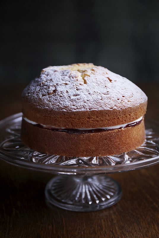 本来はスポンジ生地を2枚焼いて作るのを、焼くのは1枚にして厚みを半分に切って、より手軽に作れるようにした「ヴィクトリアサンドイッチケーキ」。