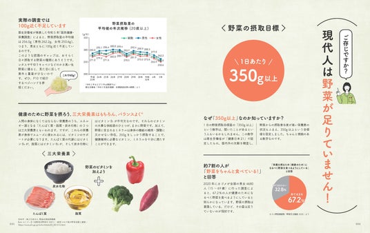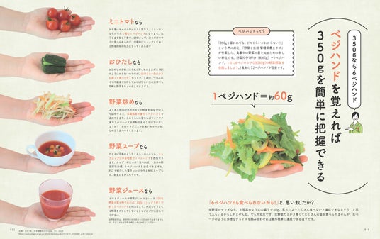 カゴメで働く管理栄養士による専門チーム「野菜と生活 管理栄養士ラボ(R)」 の知識と経験、ならびにカゴメのオウンドメディア「VEGEDAY」の情報をもとにつくられた本書。「1日350gの野菜を食べないといけないのはわかっているけどなかなか達成できない……」、そんな人にこそ読んでいただきたい一冊です。野菜60gを1べジハンドと数え、毎日無理なく6べジハンド摂る方法を紹介しています。