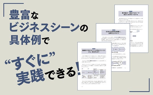 「数学脳を構成する6つの力」と言われても、抽象的でピンとこないと思いますが、安心してください。本書では、コピーライターや営業担当者、分析担当者といった職業の具体的なビジネスシーンの中で、どのように「数学脳」が役立つのか、具体例を交えて紹介しています。さまざまな職業の方々と日々仕事をしている著者だからこそ表現できるビジネスシーンのリアルな描写によって、自身のビジネスに活用することができます。