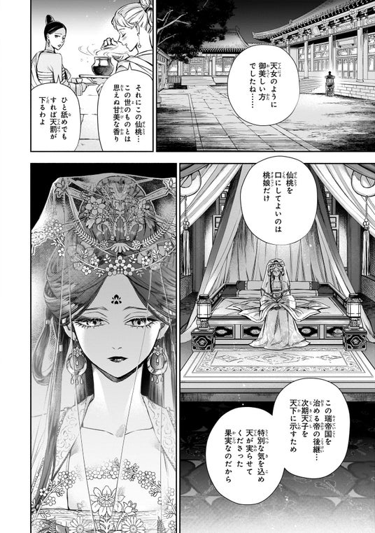 桃を食べて育ったという、並外れた美貌を持つ彼女たちは、その血、肉、存在すべてが太子に力と天恵を与える。