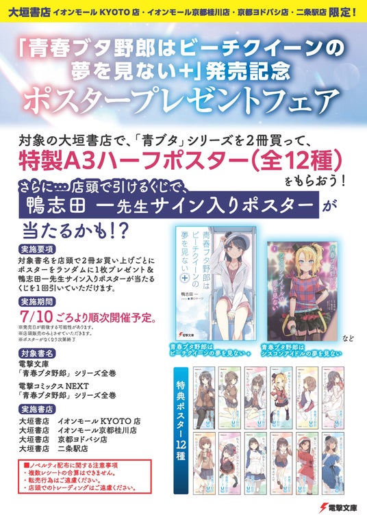 また、大垣書店の対象4店舗では『青春ブタ野郎』シリーズを2冊購入ごとに、特製A3ハーフポスター(全12種)をランダムに1枚プレゼント。