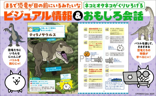ネコとオタネコがくり広げるおもしろ会話とともに、恐竜たちとのバトルが展開。ティラノサウルス、トリケラトプス、ブラキオサウルスなど、全45種の恐竜について、その特徴や強さの秘密を自然と理解できます。