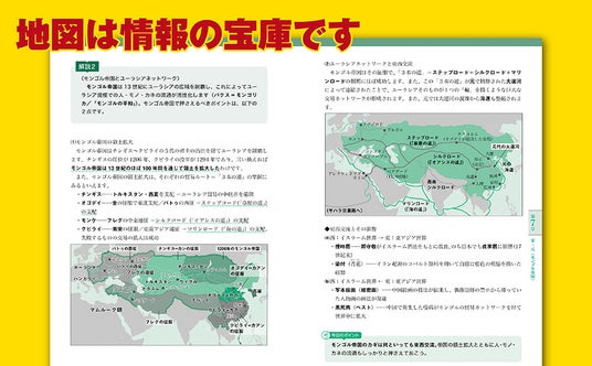 勢力図・交易路・宗教の広がりなど多層的な情報を一望でき、複雑化した共通テストの資料読解にも直結。本書で提示する視覚化された情報(地図)が思考のスタートラインになります。