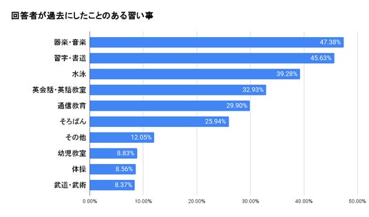 最も多かったのは、ピアノなどの「器楽・音楽」系の習い事で、半数近くの方がやった事があると回答。後述する「お子さんがしたことのある習い事」では少なかった「習字・書道」と「そろばん」が上位に入り、「習字・書道」は半数近く、「そろばん」は4人に1人がやったことがあるという結果になりました。