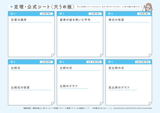 ダウンロード特典として、中学数学の定理・公式シート(A4サイズ)をつけました。プリントアウトしたり、スマホに取り込んだりすることで、いつでも数学の復習ができます。