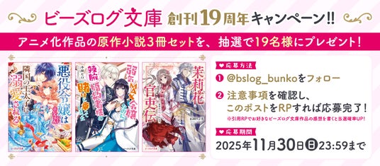 株式会社KADOKAWA(本社:東京都千代田区、取締役 代表執行役社長 CEO:夏野剛)のビーズログ文庫は、2025年10月に創刊19周年を記念してビーズログ文庫19周年フェアを開催いたします。