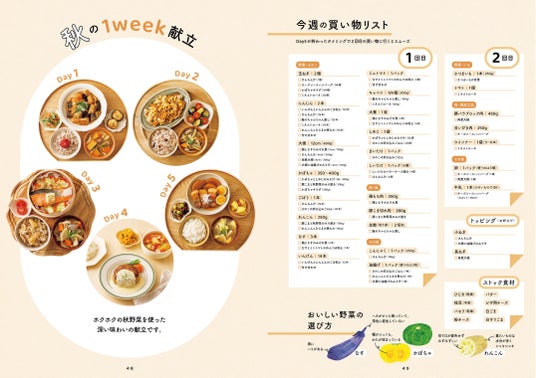 本書では、忙しい日々でも無理なく作れるよう、1週間ごと/日ごとの買い物リストを収録! 準備や買い物の手間も、食材のムダ買いの心配もありません。生ものの保存などの手間を最小限にするため、5日間の買い物を2回に分けているのもリアルなポイントです。1日ずつの食材リストもついているので、ライフスタイルにあわせて使い方を選べます。