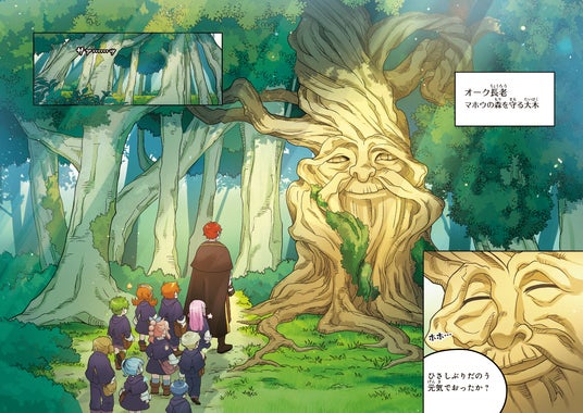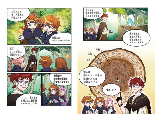 野外授業で森に出かけた主人公たち。森を守る大木「オーク長老」が何歳であるかを考えるため、年輪を観察します。
