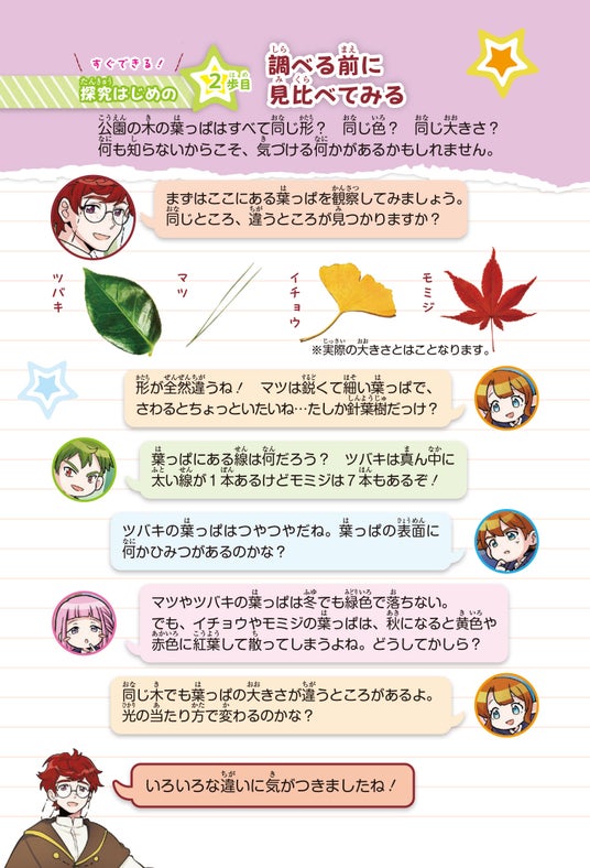 本書を読めば、葉っぱの形を比べるなど、身近な自然の観察から「なぜ?」を見つけ、探究学習を実践するヒントをつかんでいくことができます。