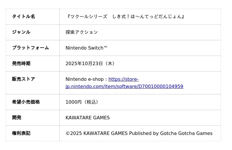 このたび、株式会社KADOKAWAのグループ会社である株式会社Gotcha Gotcha Games(本社:東京都千代田区、代表取締役社長:成田聖)より、2025年10月23日(木)に、『ツクールシリーズ しき式!ほ~んてっどだんじょん』をニンテンドーeショップにて発売させていただきましたこと、及び発売記念セールを開催することをお知らせいたします。