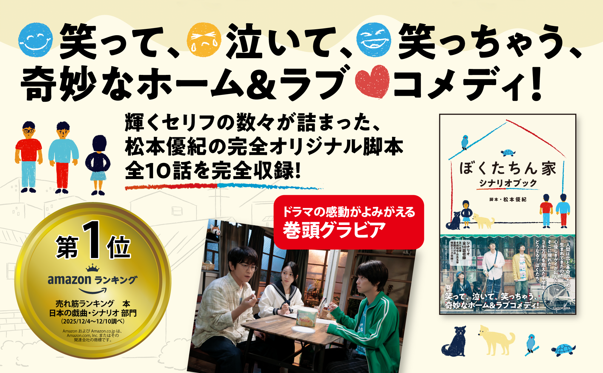 株式会社KADOKAWA(本社:東京都千代田区、取締役 代表執行役社長 CEO:夏野剛)は、2025年12月15日(月)に、松本優紀・脚本『ぼくたちん家 シナリオブック』を発売いたしました。電子書籍も同日より配信開始しました。