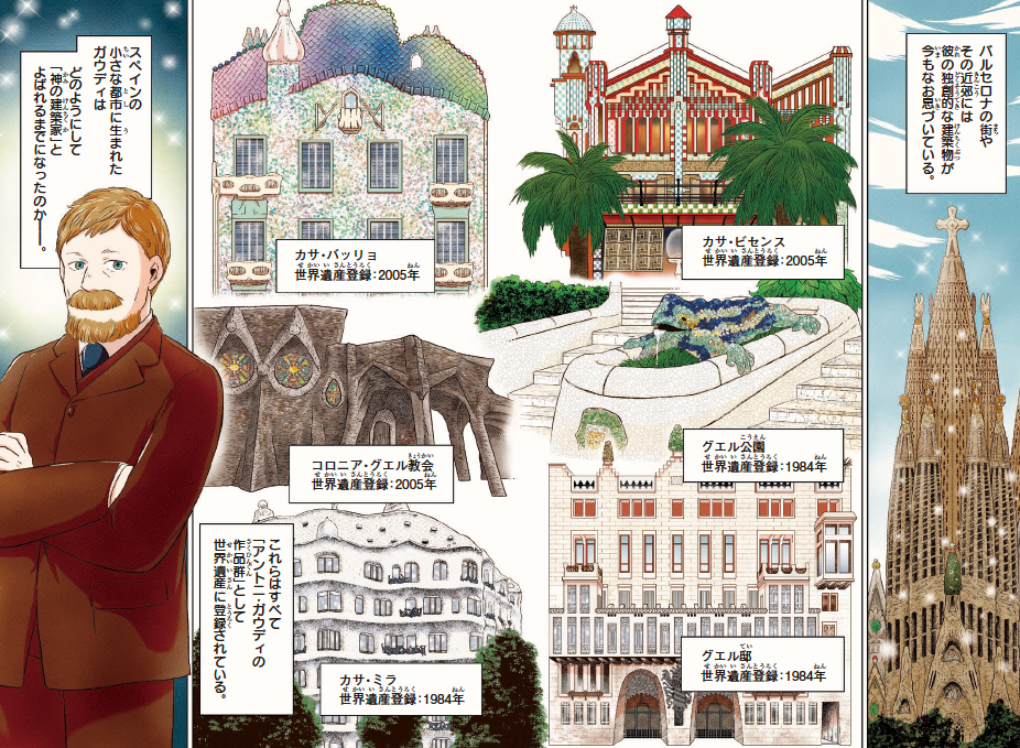 ▲まんが冒頭。世界遺産「アントニ・ガウディの作品群」の紹介。
