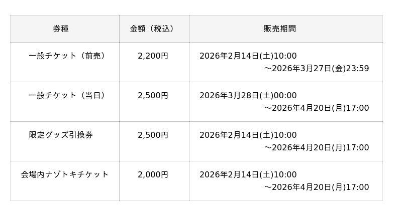 ・「限定グッズ引換券」および「会場内ナゾトキチケット」は、先着制販売です。なくなり次第販売終了となります。